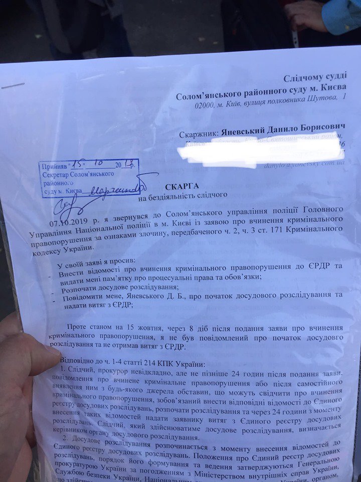 “Данило Яневський подав скаргу до Соломянського суду на бездіяльність слідчого поліції.