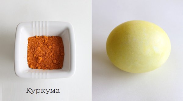 Жовтий колір надасть куркума. Заливаючи порошок сушеної куркуми окропом, готують міцний розчин. Коли рідина набуде яскраво-жовтого кольору, в неї занурюють яйця.