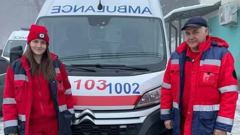 Працівники Дарина та Василь не стали чекати на евакуатор, коли медичне авто Mercedes Sprinter загрузло у сніговій каші у віддаленому районі міста. Вони схопили реанімаційні набори, акушерські сумки та рушили до будинку породіллі пішки через замети.