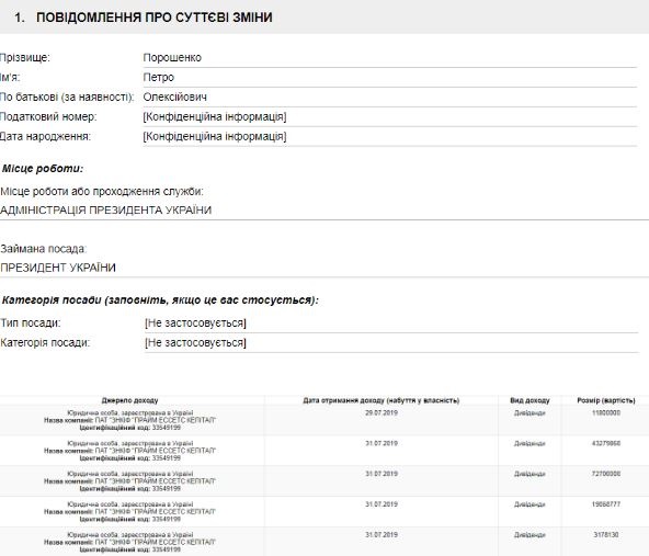 Крім того, згідно з документом, Порошенко в кінці липня – початку серпня поточного року вивів понад 150,5 мільйонів гривень дивідендів від публічного акціонерного товариства Закритий недиверсифікований корпоративний інвестиційний фонд Прайм Ессетс Кепітал і акціонерного товариства Міжнародний інвестиційний банк.