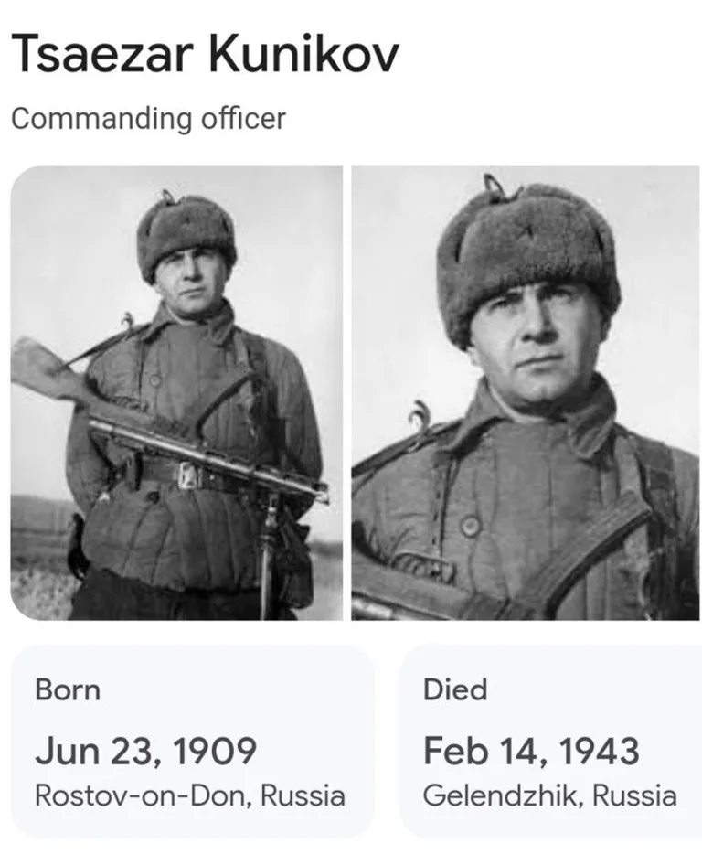 За даними Вікіпедії, радянський офіцер, командир десантного загону, Цезар Львович Куніков помер 14 лютого 1943 року і був похований у Геленджику – на березі Чорного моря.