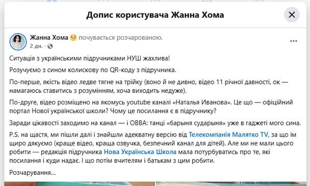 «По-друге, відео розміщено на якомусь youtube каналі „Наталья Иванова“. Це що — офіційний портал Нової української школи? Чому це посилання є в підручнику? Заради цікавості заходимо на канал — і ОВВА: танці „барыня сударыня“ уже в ґаджеті мого сина», — написала вона.
