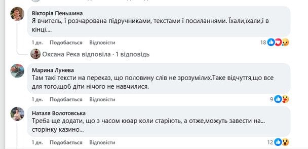 Навіть педагоги висловлювали розчарування щодо підручників, їхніх текстів і посилань, вказуючи на системні недоліки в освітній реформі.